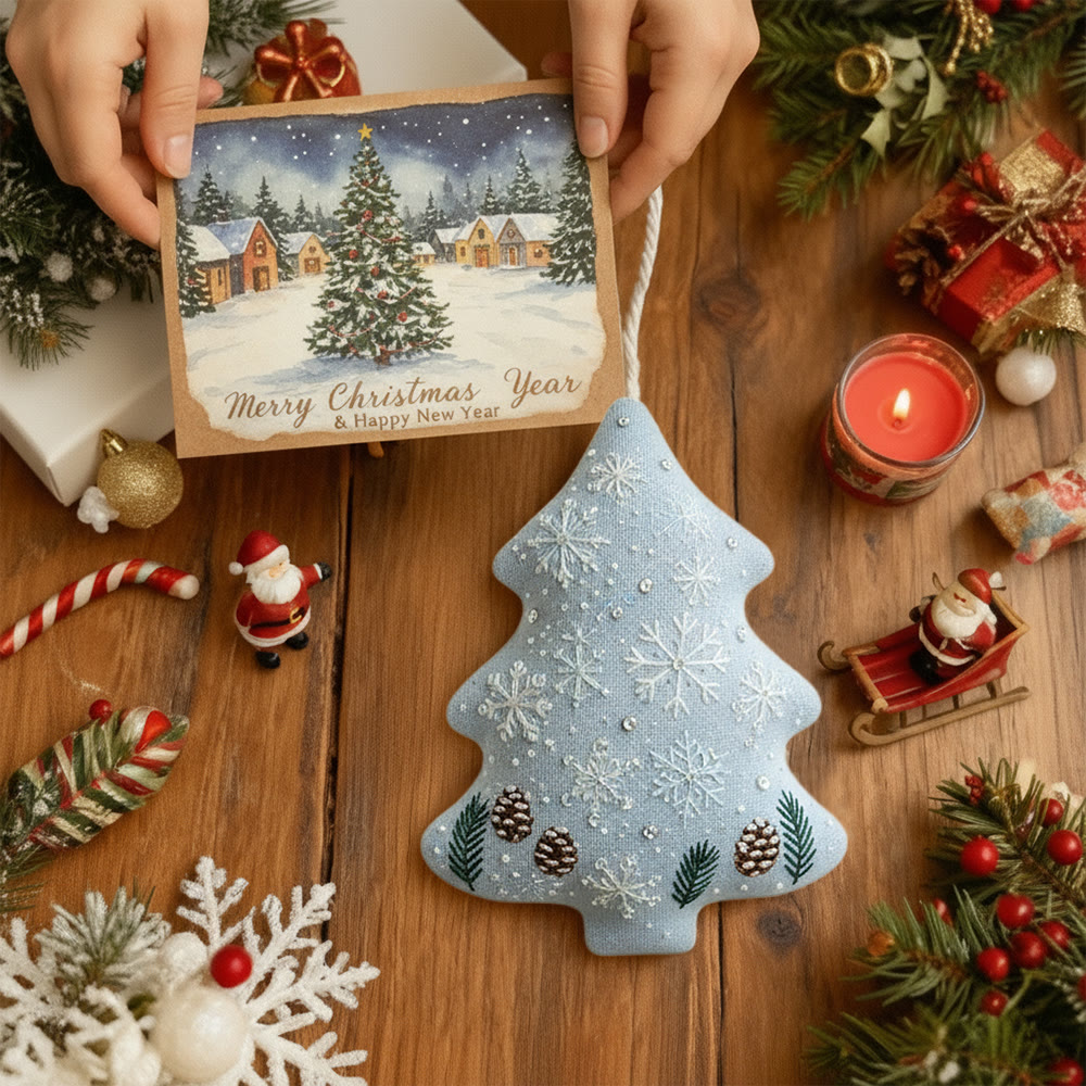 Rubbyoo Tree-shaped Embroidery Kit - Light Blue Snowflake-pinecone | Sophisticated Trimming | Go-to Holiday Gift Choice