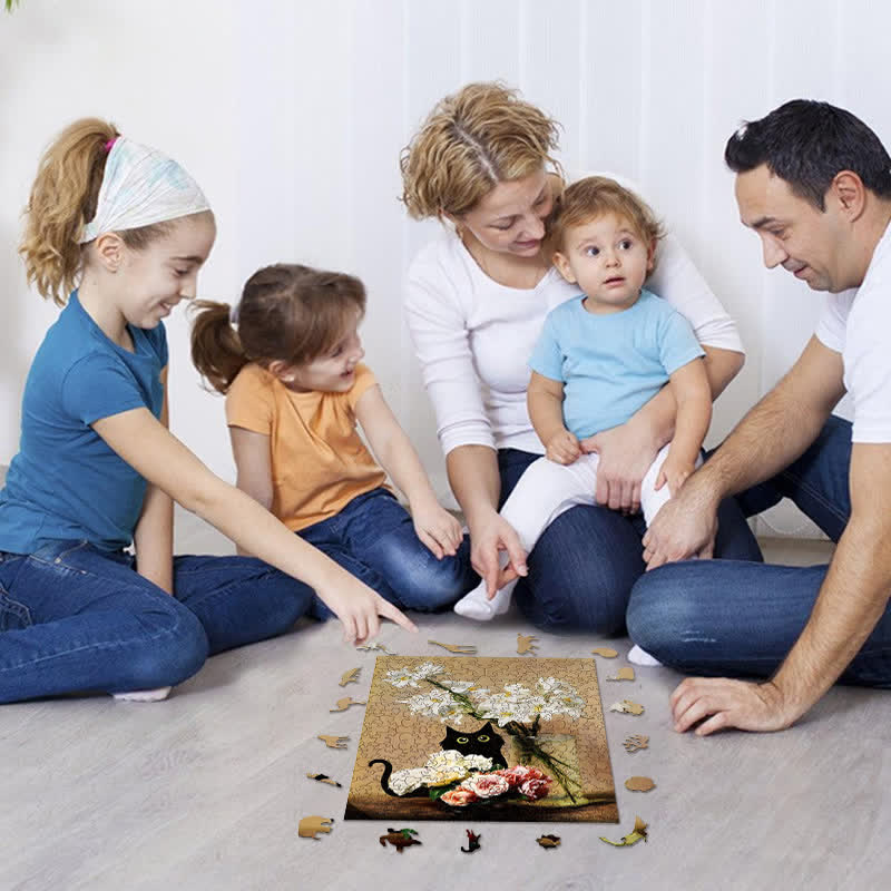 Rubbyoo Cute Black Cat With Roses And Lilies - Wooden Jigsaw Puzzle