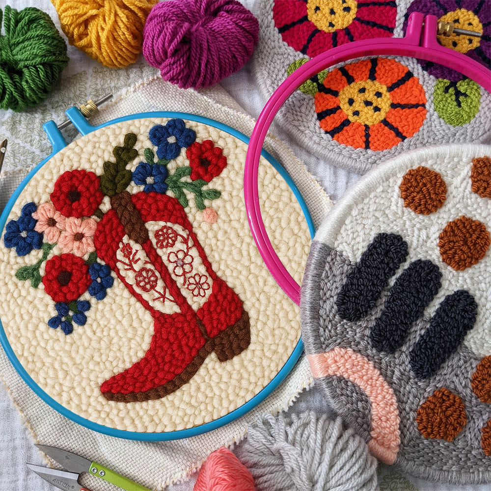 Floral Red Cowboy Boot Punch Needle Kit – Beginner Starter Handcraft | Room Decor Accent